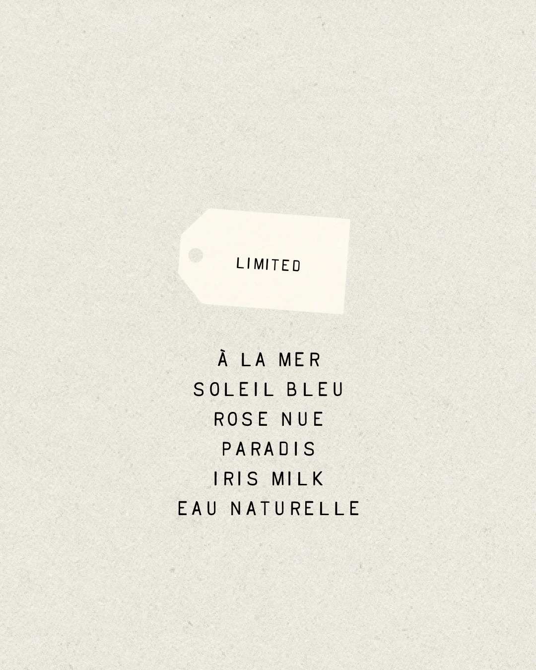 Limited Edition Fragrances: A La Mer, Soleil Bleu, Rose Nue, Paradis, Iris Milk, Eau Naturelle