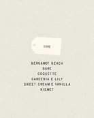 Core Collection Fragrances: Bergamot Beach, Neroli Blossom, Bare, Gardenia & Lily, Sweet Cream & Vanilla, Kismet