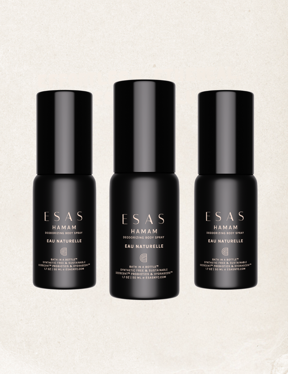 HOW IT WORKS : Inspired by the ancient Hamam ritual, Esas Hamam Deodorizing Body Spray is your "bath in a bottle," designed to purify, cleanse, and refresh. Rooted in a tradition that dates back to the 14th century, this unique body spray brings the essence of Roman baths into the modern day. Scientifically formulated with the purest ingredients, including Certified Organic Botanical Alcohol*, Witch Hazel, Coconut-Derived Glycerin*, and Esas DeoScent™ Sugarcane Ferment*, it effectively cleanses, deodorizes, and refreshes your skin wherever you go. Enriched with hydrating hyaluronic acid, vitamin E, and antioxidant-rich grape leaf tincture, this spray not only purifies but also nourishes, leaving your skin feeling revitalized and lightly scented. Perfect for an on-the-go refresh, it's the ultimate solution for staying clean, refreshed, and fragrant throughout your day.