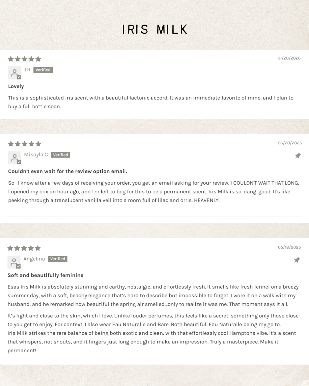 IRIS MILK: A fragrance of quiet elegance and luminous serenity. Iris Milk drapes the skin in a weightless veil of creamy vanilla bourbon and silky-smooth milk. Velvety iris and tender lilac bloom softly, their powdery hues melting into the warmth of intoxicating vanilla. Subtle yet radiant, comforting yet euphoric—this is scent in its dreamiest form. Effortless, ethereal, endlessly alluring.
