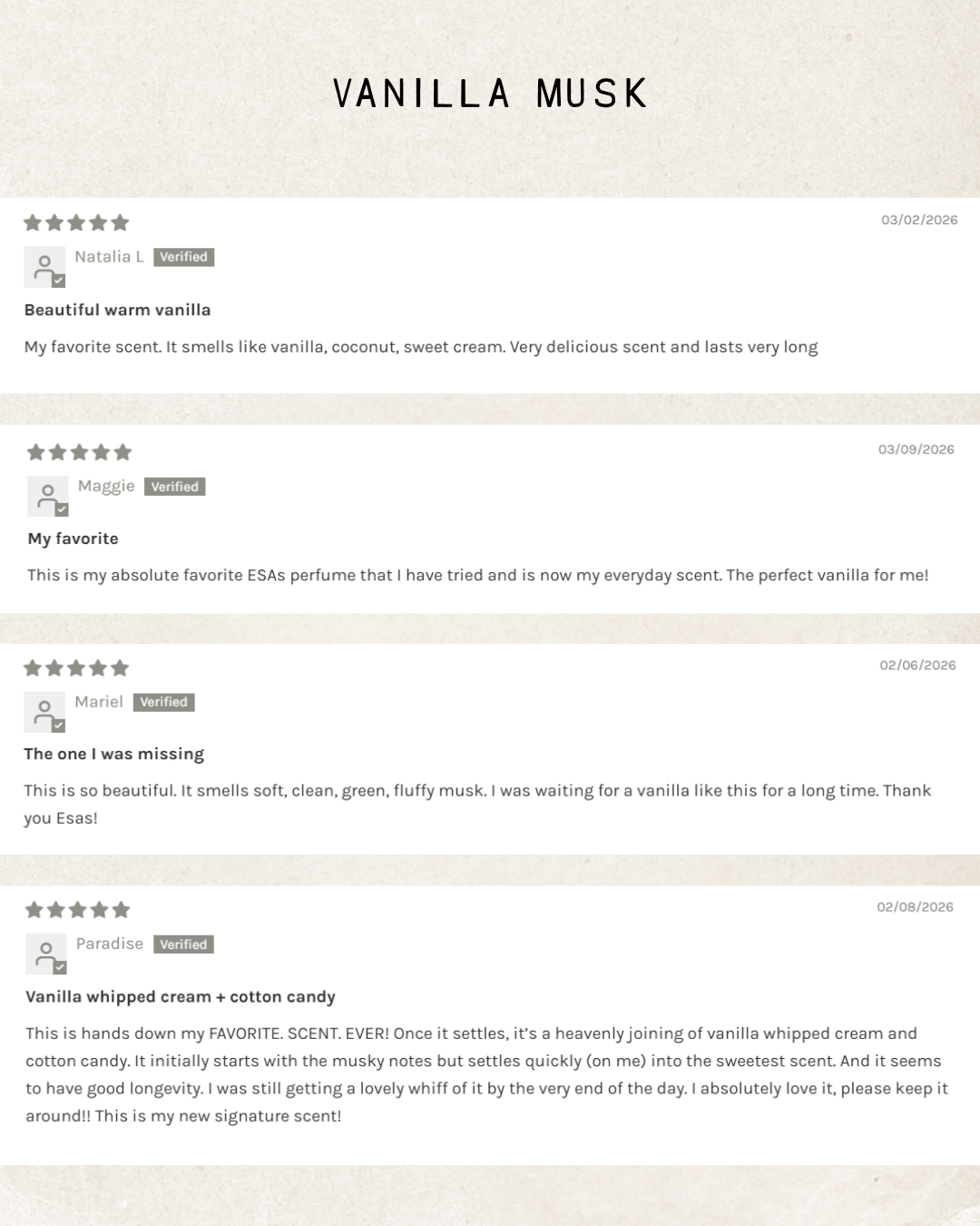 VANILLA MUSK: Light, airy, natural profile, evoking a gentle, cloud-like butteriness. Vanilla Musk should embody a sense of warmth, comfort, and elegance without heaviness, ideal for a soft and uplifting scent experience.