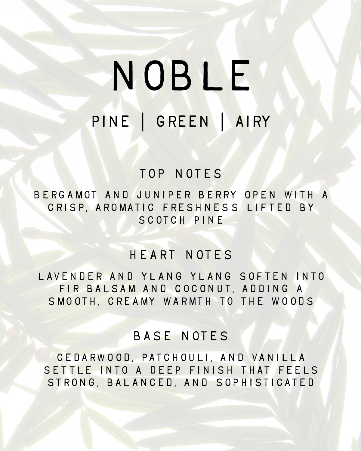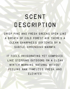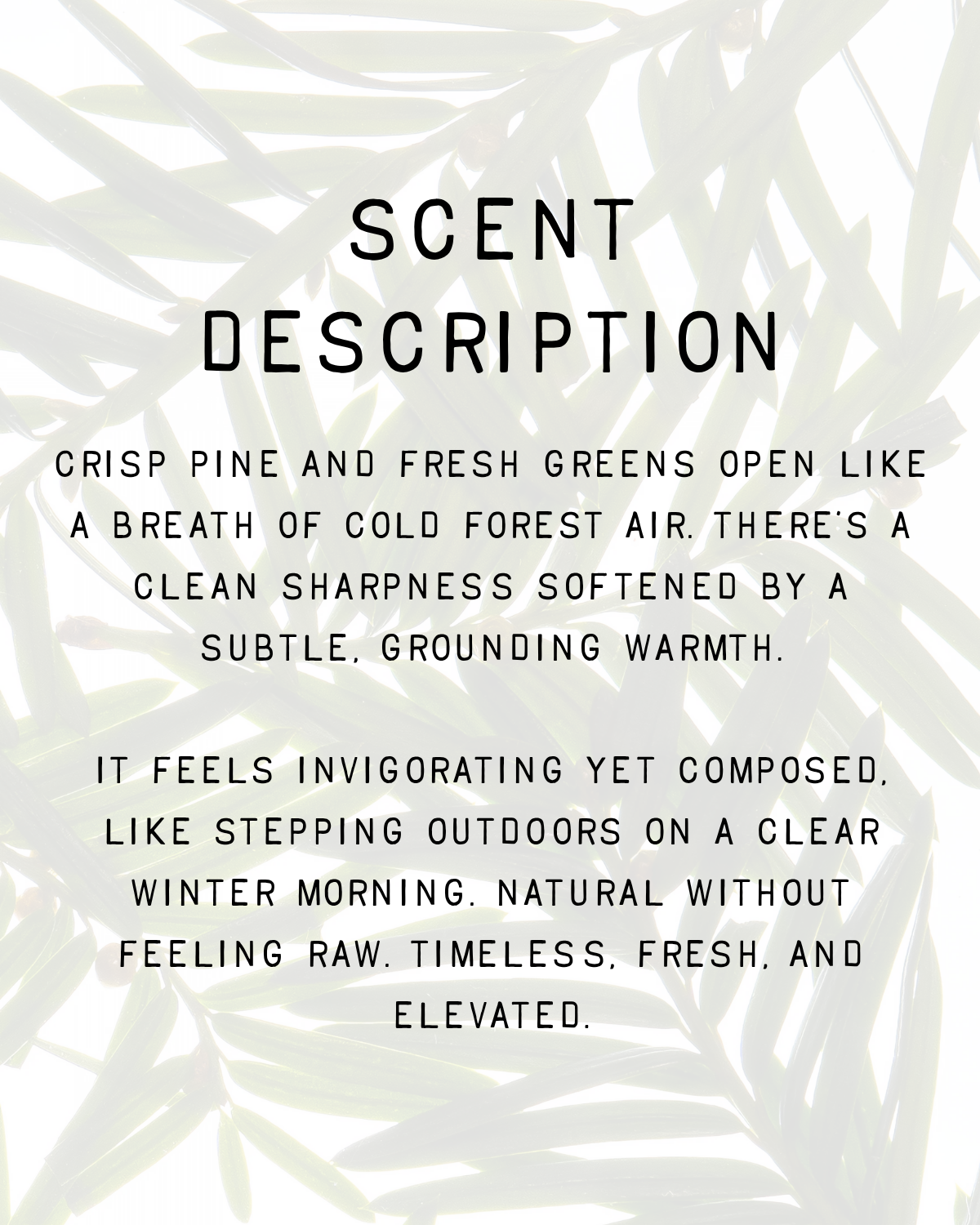 Crisp pine and fresh greens open like a breath of cold forest air. There’s a clean sharpness softened by a subtle, grounding warmth. It feels invigorating yet composed, like stepping outdoors on a clear winter morning. natural without feeling raw. Timeless, fresh, and elevated.